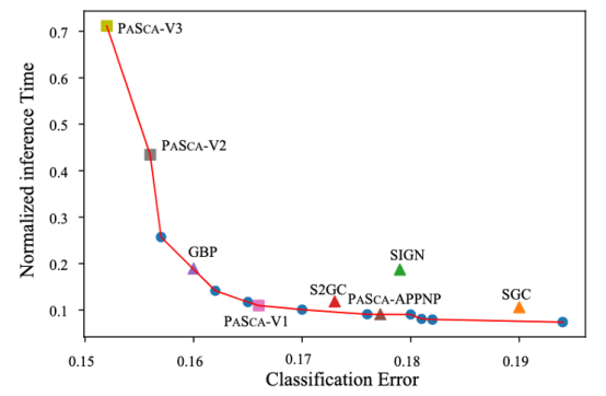 如图 8 所示,实验展示了 PaSca 系统在 Cora 数据集的搜索结果的帕累托平面。本文从中挑选了 3 个代表性的模型,分别命名为 PaSca-V1, PaSca-V2 和 PaSca-V3。这些代表性模型能兼容不同的优化目标,比如 PaSca-V3 取得了最小的分类误差但是比 PaSca-V2 的预测时间更久。