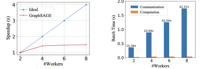 本文比较了基于 SGAP 范式建模的 PaSca-APPNP 模型以及基于 NMP 范式建模的 GraphSAGE 模型在分布式场景下的可扩展性。固定总的批处理大小并增加工作节点的数目,如图 7 所示,实验发现 PaSca-APPNP 能够获得更接近理想情况下的加速比。