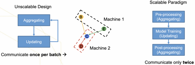 区别于现有的消息传递机制,本文提出的 Scalable Paradigm(SGAP)将消息聚合操作和更新操作分离,定义了可扩展性图神经网络建模的新范式:前处理—训练—后处理,消息聚合操作只存在于前处理和后处理中,极大地降低了分布式场景下的通信开销。