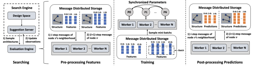 验证引擎的主要是用来高效评估被推荐的模型性能。对于前处理和后处理阶段,图数据聚合器会将图数据划分并存储到多台机器上。对于任意节点,当它的第 i - 阶消息计算完成之后,工作节点会拉取它的邻居信息并计算它下一阶的信息。在训练阶段,每个工作节点都可以用批训练的方式基于参数服务器来实现网络参数的更新。