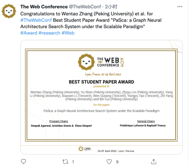 在2022年国际万维网顶会(The Web Conference,简称 WWW 2022)中,北京大学-腾讯协同创新实验室(以下简称联合实验室)论文 《可扩展的图神经结构搜索系统 (PaSca: a Graph Neural Architecture Search System under the Scalable Paradigm) 》斩获大会唯一的最佳学生论文奖(Best Student Paper Award)。