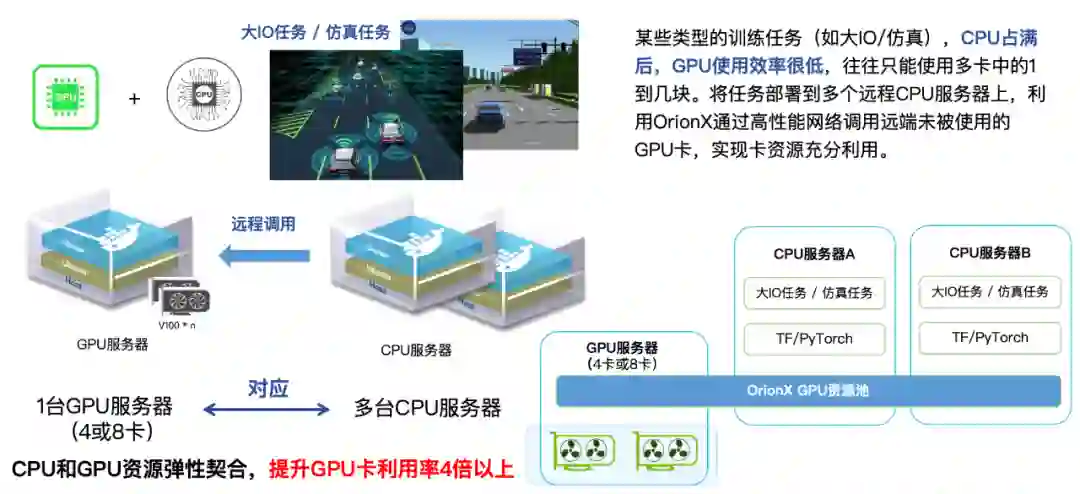 大多数的AI开发涉及到从数据准备,预处理,模型训练,调参,部署模型,线上推理,持续监控,数据收集,迭代优化的过程。在整个业务流程中,有些工作是需要大量CPU,不需要GPU资源的,在CPU运算的时候,其实GPU是闲置的;在一个自动驾驶客户那里,我们看到在仿真场景下,一个8卡的GPU的服务器,在CPU耗尽(占用100%)的情况下,最多只能使用到其中的3块GPU卡,剩下的5张GPU卡处在闲置状态,无法被充分利用。同样的道理,也可能存在GPU卡在大量占用,CPU资源被闲置的情况。通过利用软件定义的AI算力,将CPU和GPU解耦,一举解决CPU/GPU资源不匹配的问题。