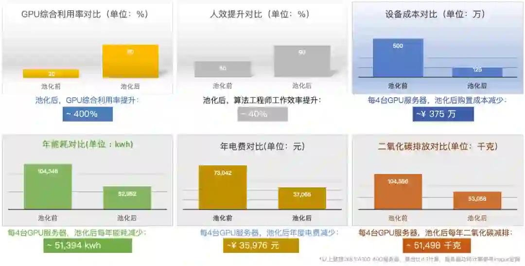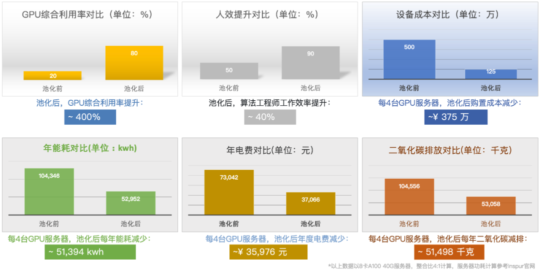 通过调查,绝大多数的用户业务为了保证业务的隔离性,不受其它AI业务的干扰,保障服务的SLA,都是运行在独立的GPU卡上。在这种情况下,GPU卡的算力和显存使用往往不到20%,这样造成了大量的资源浪费——近80%的算力和显存其实是被白白消耗,而且还有与之相关的电费,运维费用。通过软件定义的方式,提供细颗粒度的GPU资源复用单卡,保障业务运行的隔离性,可靠性和性能。大部分采取趋动科技池化方案上线生产业务的客户,可获得3倍以上的提升收益。
