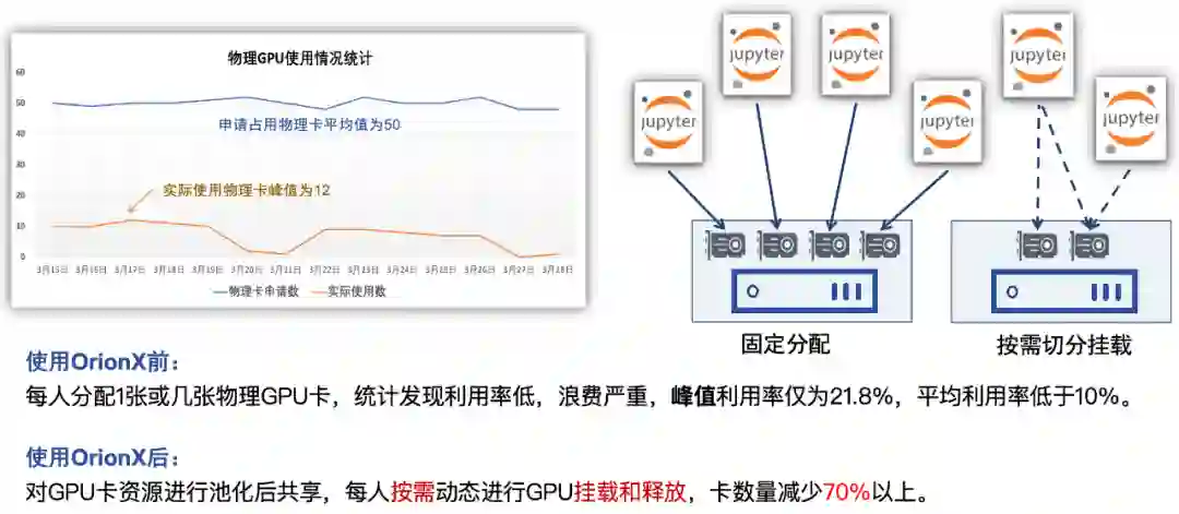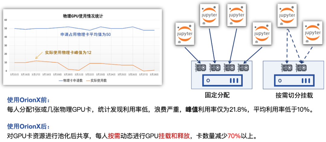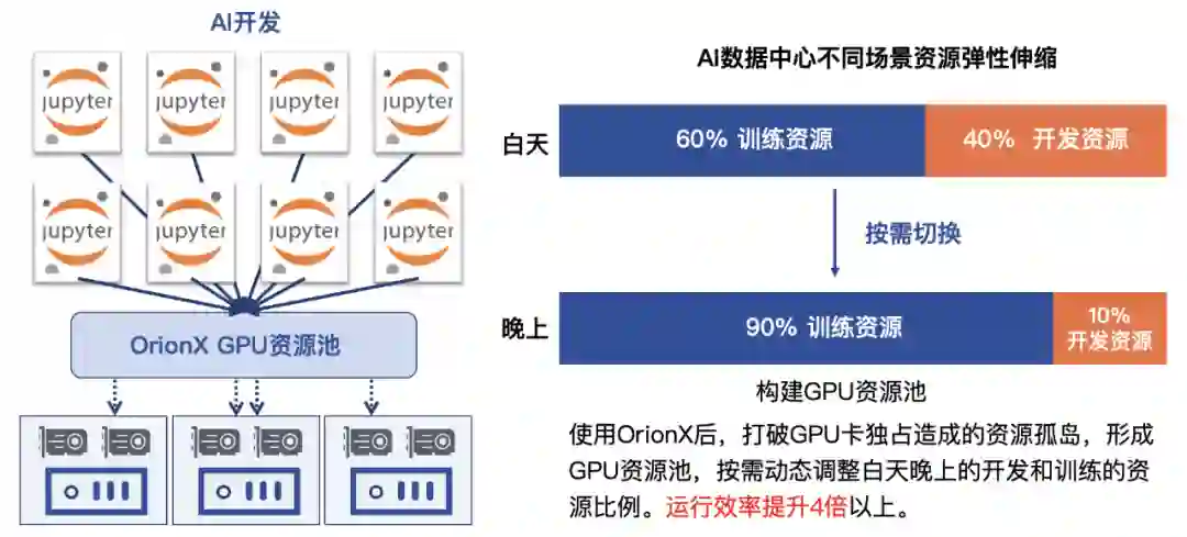 在前两种场景中,不管是AI开发,还是AI线上推理,基本上都是白天比较繁忙,卡利用率相对较高。到了晚间,卡资源基本就处于闲置状态,白白浪费!在一个证券客户那里,我们尝试着利用OrionX解决这个问题。通过软件定义的方式,弹性的分配和调度资源,晚上利用卡资源进行训练任务的运算,大大提升了闲时(夜间)资源利用率。