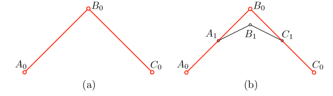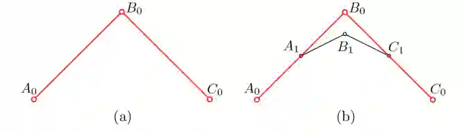 其实我们研究一条线段上两个点的变化即等价于我们研究矩阵前两行、前两列. 显然上面这个问题太过简单,根本无法满足读者的胃口,所以我们再举一个采用“1-2-1法则”细分曲线的例子. 这次我们目标同样是找到极限光滑曲线上的一点. 如图(a)我们来看曲线上一个由相邻三点组成的局部,