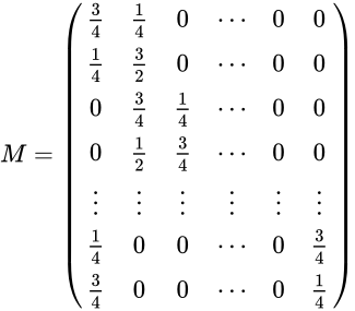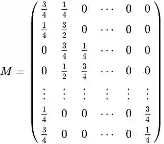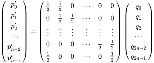 之前我们提到在经过无穷多次细分后,我们会得到一条光滑曲线. 当我们已知平均的规则后,其实并不需要利用计算机进行无穷多次递推或矩阵乘法计算来得到光滑曲线,相反多次计算会造成很大的累计误差。通过对矩阵的特征值分析,我们得到矩阵次方,即递推数列的通项,也就是最终光滑曲线的精确解.