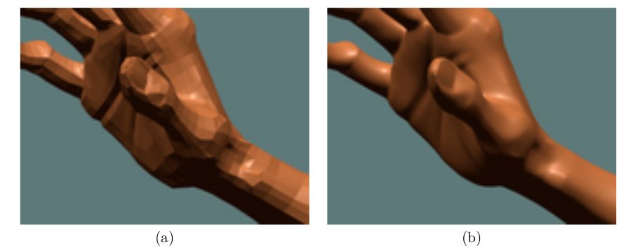 上图是皮克斯在1997年制作的动画短片《Geri's Game》中主角的一只手. 实际上,在当时短片的制作过程中,是由该片的导演,恰好也是一位雕塑家,先雕刻出一个模型扫描进电脑(a),然后再通过细分技术得到更真实的效果(b).