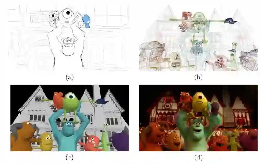 上面四张图展示了《怪兽大学》中的一个画面场景的制作流程,从最简单的分镜脚本(a),到网格状的原型(b)、再到平面着色的预览图(c)、最终得到具有更多纹理和阴影的极具真实感的画面.