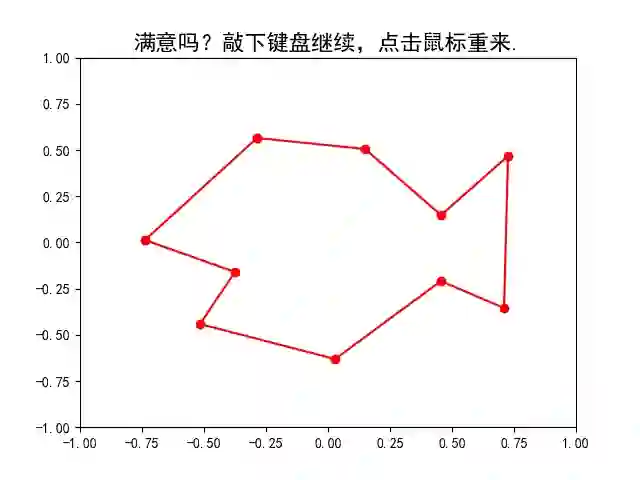 如上面动画所演示的,首先我们有一些点组成的有序列表(以下简称点列),并用线段连接相邻两点,即得到一条初始曲线(为了回避对曲线边界情况的处理,本文仅讨论封闭曲线的情况,即认为点列首尾相邻). 然后不断重复下述两个步骤.
