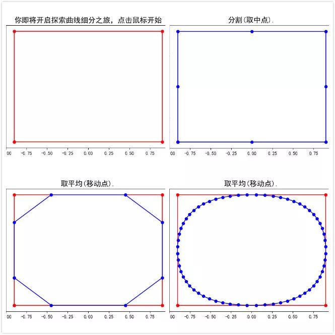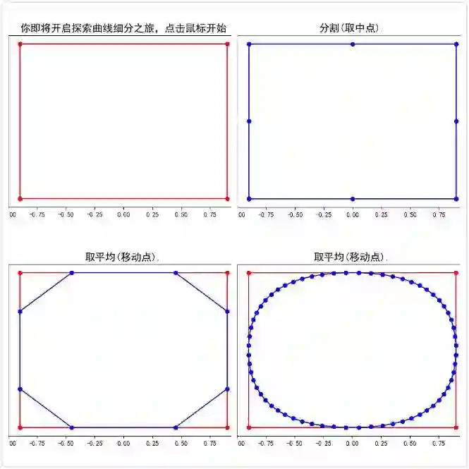 具体地,请看上面的示意图,我们用蓝色标记点列中的点. 从上左图到上右图完成了分割,点列由原来正方形的四个端点变为八个点;从上右图到左下图完成了平均,点列中的点即上右图中八个点相邻两点的中点. 而右下图是重复多次细分操作后所得的曲线,不难想象在经过无穷多次操作后即会得到一条光滑曲线(多边形的边长无限趋近于0).