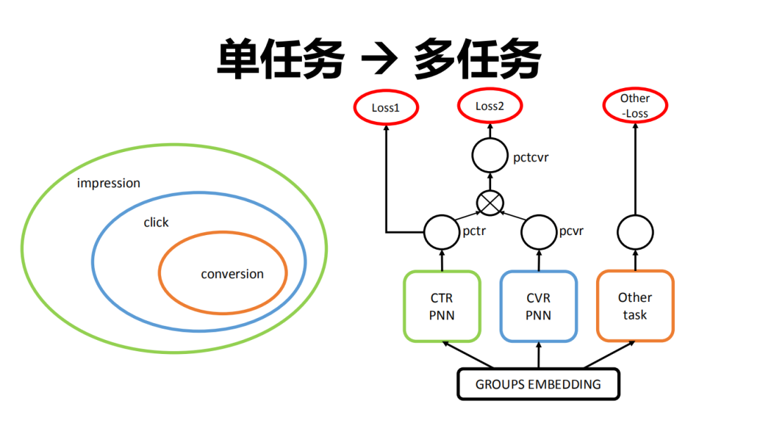 转化率模型初期只考虑了点击到转化的样本,训练出一个单任务的转化率模型。随着ESMM和ESM2的出现,360的转化率模型从单任务向多任务模型发展。单任务模型考虑的是点击后到转化的样本,只考虑了曝光的子集样本。如何保持线上线下一致,将曝光无点击的样本加入训练,这就是多任务模型解决的问题。完整的样本空间,子模块CTR PNN模型是曝光样本的点击概率,LOSS1是pctr的loss,子模块CVR PNN模型是点击后转化的概率模型,pcvr表示该曝光样本如果点击,点击到转化的概率。实际需要对于每个曝光样本做曝光转化预估,那么将pctr * pcvr就得到了曝光转化概率pctcvr,而LOSS2就是该曝光转化的loss。曝光到转化之间还存在其他链路,可以使用更多的任务和loss来表示。另外,多任务模型会共享group embedding输入。
