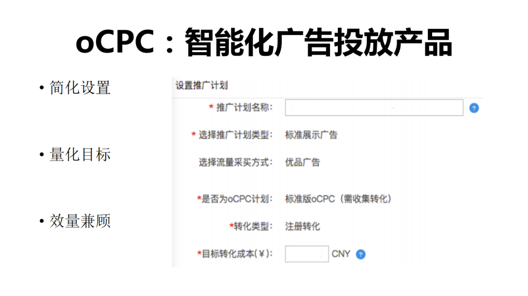 o是optimize,oCPC是针对CPC的广告优化。右图展示的是oCPC的广告设置界面。oCPC的特点如下: