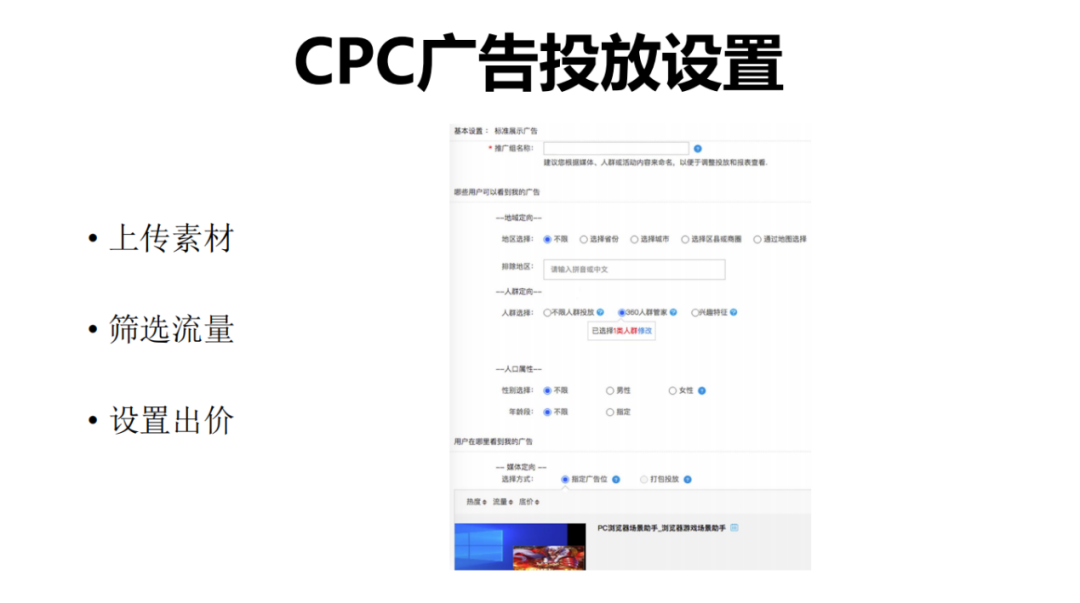 相比于正常的CPC广告界面,该界面简化了设置内容,不需要设置点击出价;