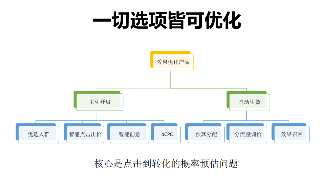 360效果优化产品设计的基本理念是一切选项皆可优化。可以将效果优化产品分为两大类,一类是广告主主动开启使用,一类是后端策略优化自动生效。产品的核心是点击到转化的概率预估问题,结合广告主需求去拓展可以做效果优化的场景。