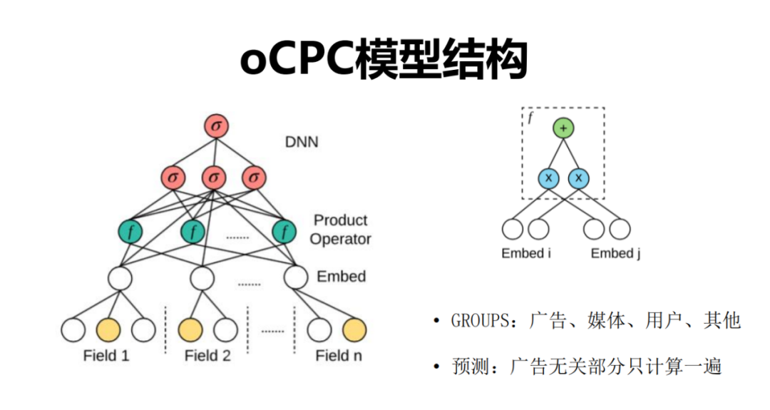 oCPC模型结构采用PNN架构,将特征分为多个group——广告、媒体、用户、其他上下文;每个group学习一个embedding表示,然后使用embedding相乘得到特征交叉。考虑到神经网络的复杂性,线上计算做了性能优化,预测时广告无关的部分只会计算一次,只有不同的广告特征才会被多次计算。