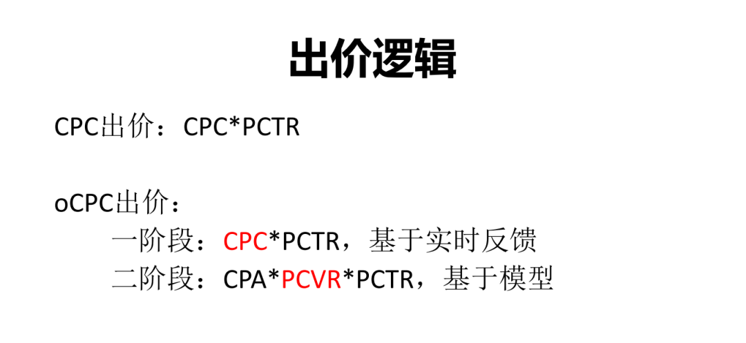 普通CPC的出价逻辑,从DSP角度来说,通过点击率预估建立与广告主目标的桥梁,即CPC * PCTR。对于oCPC的出价逻辑:一阶段基于实时反馈,广告投放初期数据少,由系统给出CPC,根据线上实际转化成本的情况来调整出价。二阶段基于模型,当数据积累到一定阶段,训练转化率模型得到PCVR,用客户给出的目标出价CPA*PCVR来模拟CPC出价,即CPA * PCVR * PCTR。