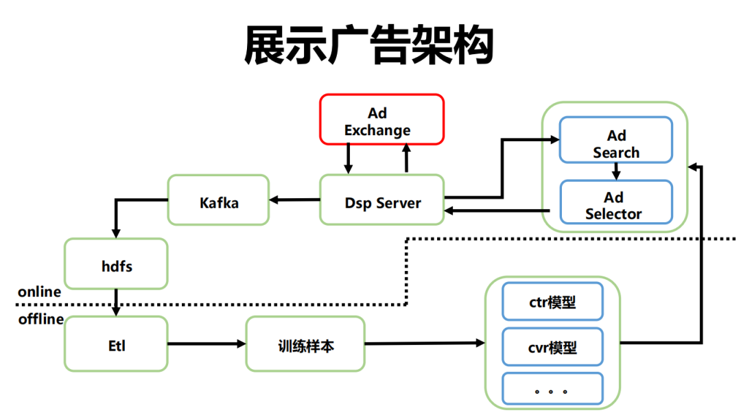 展示广告技术架构,可以分为线上系统和线下系统。线上系统以DSP Server切入,Ad Exchange会将流量发送给DSP Server,DSP Server会将信息传递给Ad Search,Ad Search是广告的检索召回系统,海量广告中粗召回匹配的几百个甚至上千个广告投放,Ad Search会将信息发送给Ad Selector,Selector会在几百个广告中选择当前最合理的一个返回给DSP,DSP再返回给Ad Exchange。整个过程的数据都会被记录,以消息的形式发送给Kafka,最后存储在hdfs上。线下系统,ETL会将数据转成标准的训练样本,这些训练样本会提供给CVR、CTR等模型训练,训练好的模型在由线下推送到线上,交给Ad Search、Ad Selector作为广告召回和排序使用。