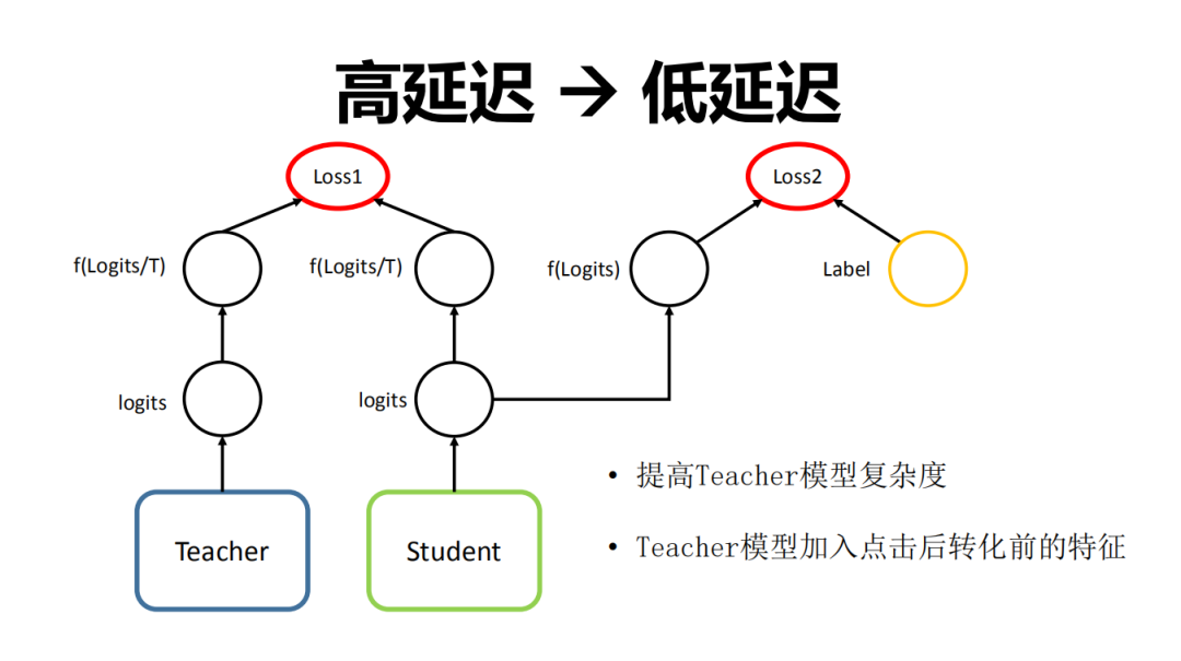 知识蒸馏解决线上高延迟问题。知识蒸馏存在Student模型参数减少过多,导致效果Teacher模型差很多,以下是两个优化方法: