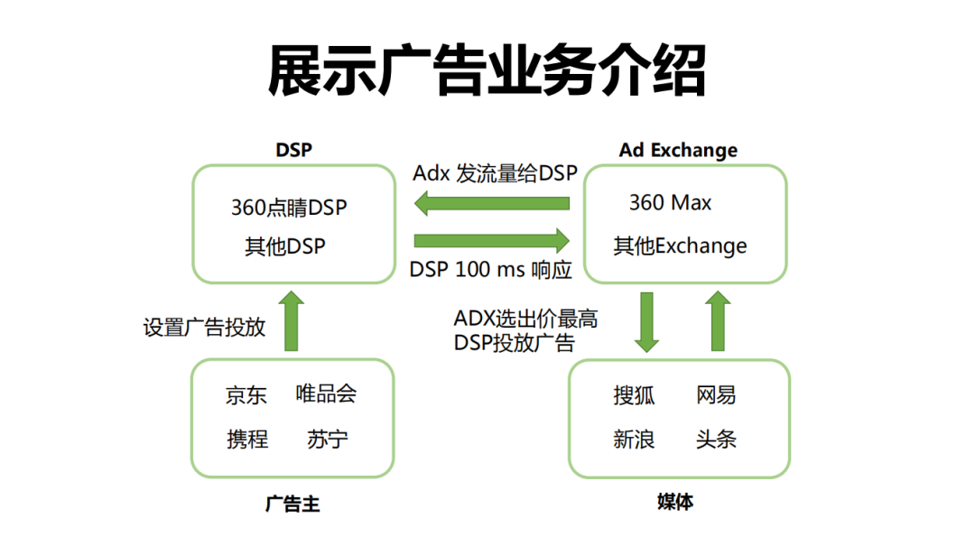 市场上有很多媒体,用户访问媒体 ( 比如PC端的搜狐、网易、新浪,移动端的头条等 ) 时页面会出广告,媒体会将用户当前流量相关信息发送给Ad Exchange ( 流量拍卖平台 ),该流量会由Ad Exchange发送给与其对接的多家DSP ( 广告投放系统 ),DSP会根据当前流量选择合适的广告返回给Exchange,响应时间要求在100ms以内,这些广告一般是由客户或者广告主 ( 比如电商类广告主京东、唯品会、苏宁,旅游类广告主携程等 ) 在DSP平台按照流量筛选条件 ( 用户、媒体、时间、地点 ) 设置,Exchange将各个DSP平台返回的结果进行整理,选择出价最高的广告返回给媒体,媒体最终将出价最高的广告展示给用户。