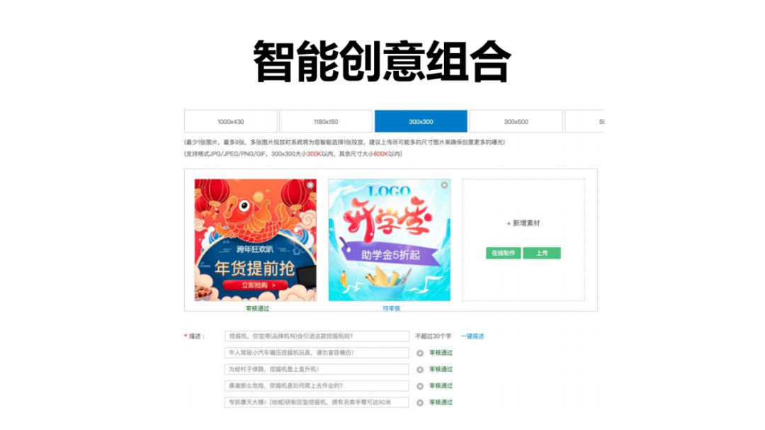 广告主在创建广告单元上传素材时,有很多的素材(图片文案)组合选择,但是不清楚哪种组合转化效果最好,所以广告主会在投放过程中,根据实际的投放效果,选择最佳的素材组合,关闭其他组合。智能创意组合,就是为了解决广告主的这个需求而设计的产品。上图展示的是广告主上传素材的界面,允许广告主上传多个图片和多个文案,算法会根据当前流量选择最佳的图片和最佳的文案组合展现给用户。
