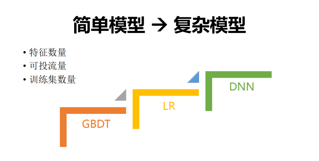 随着产品的迭代,模型从简单模型发展到复杂模型。产品初期,仅在精细流量上做投放,采用GBDT就可以满足需求。随着可投流量和特征数量增加,GBDT的树深度和棵数有限无法满足需求,采用LR模型解决可投流量扩展问题。随着业务发展拥有海量数据,传统模型存在瓶颈,最终采用了DNN模型解决海量数据问题。