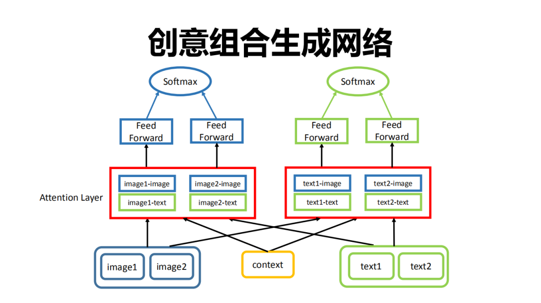 智能创意组合算法通过强化学习思路实现,打分模型为转化率预估模型,根据当前流量信息和生成网络得到的图片文案的组合作为输入,得到转化率;转化率越高,创意组合越有价值。创意组合生成网络是根据Attention机制实现的,生成网络的输入为图片、文案、上下文信息。在生成网络结构中,以image1为例,将其作为query,与整个图片素材库的关系以及与整个文案库的关系使用Attention建模,得到图片信息经过一个前向网络得到输出分数,如果是多图片,使用Softmax得到多图片的概率分布。组合的结果可以直接选择图片和文案概率最大的,或者是概率分布做采样。在迭代过程中,这两种方式都会有所选择来训练。