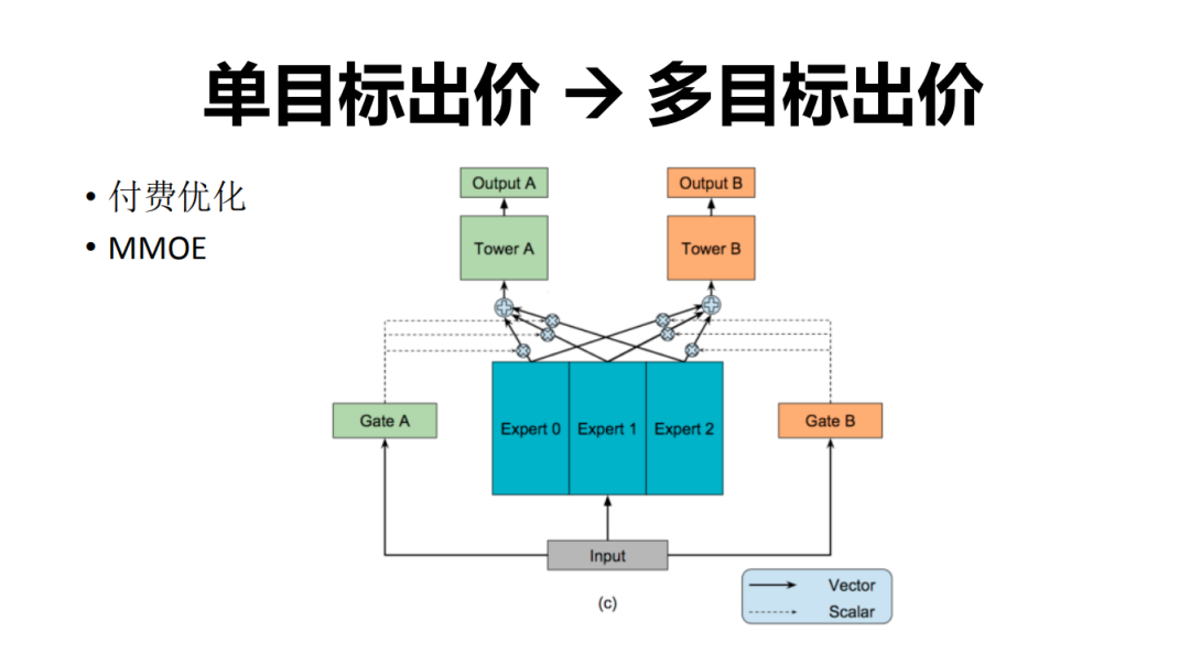 随着业务发展,客户会有更多的转化要求。在注册目标成本已经满足需求的情况下,考虑付费的优化。参考智能点击出价,训练一个付费模型,在注册率一定的情况下,付费率如果在金字塔顶层,就增加出价,在低层,就减少出价,来满足客户付费优化的需求。付费模型采用MMOE实现,注册是任务A,付费是任务B,Gata A仅作为任务A的输入,Gata B仅作为任务B的输入。对于该模型的任一任务来说,可以由几个固定的专家打分得到。那么专家的输出与Gata A 输出的概率分布作为任务A的输入,专家的输出与Gata B输出的概率分布作为任务B的输入。这个模型在同时拥有多个转化的场景中得到效果验证。