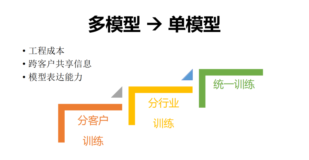 随着产品的成熟,分行业和分客户的多模型维护成本过高,使用单一模型就能满足所有客户需求。