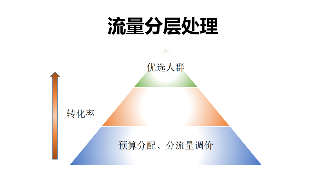 对广告来说,流量是海量的,能够产生转化的流量是极少的,那么流量按照转化的效果自下而上来看,呈现的是一个金字塔结构。针对塔底的低质流量可以采取预算分配和分流量调价两个方案。预算分配是针对点击率低的流量,设置在这类低质流量上的花费上限,如计划的10%或20%,其他主要花费重点用在高质流量上。分流量调价是从出价的角度,对于低质流量的出价是按照正常流量出价打折。塔顶的流量可以采用优选人群方案。根据用户的广告行为训练模型预测其是否会发生转化,模型输出值高的人群被归为优选人群。广告主给这类优选人群更高的出价,这样在竞价过程中更有可能胜出,得到曝光转化机会。
