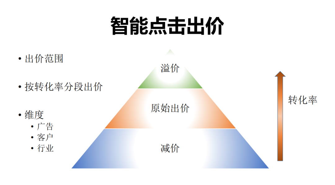 智能点击出价是一款约束了广告主平均点击成本,尽可能优化后续效果的一款广告主主动开启的产品。出价按照转化率分段处理,高段做溢价处理,低段做减价处理。线上策略可以从三个维度进行实现: