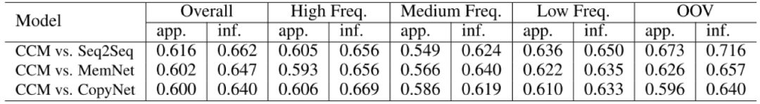 从图5中可见,CCM对于三个基线系统来说,都有将近60%的回复是更优的。并且,在OOV的数据集上,CCM比seq2seq高出很多,这是由于CCM对于这些低频词或未登录词,可以用知识图谱去补全,而seq2seq没有这样的知识来源。