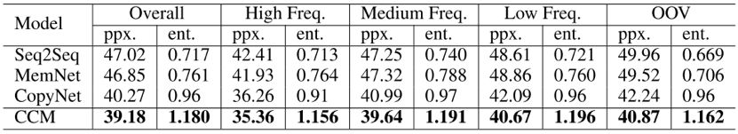 如下图4所示,为根据perplexity和entity score进行的性能比较,可见CCM的perplexity最低,且选取entity的数量最多。并且,在低频词时,选用的entity更多。这表示在训练时比较罕见的词(实体)会需要更多的背景知识来生成答复。