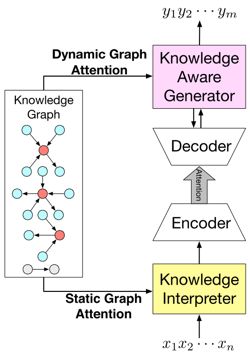 为了解决这些问题,文章提出了一种基于常识知识图谱的对话模型(commonsense knowledge aware conversational model,CCM)来理解对话,并且产生信息丰富且合适的回复。本文提出的方法,利用了大规模的常识性知识图谱。首先是理解用户请求,找到可能相关的知识图谱子图;再利用静态图注意力(static graphattention)机制,结合子图来理解用户请求;最后使用动态图注意力(dynamic graph attention)机制来读取子图,并产生合适的回复。
