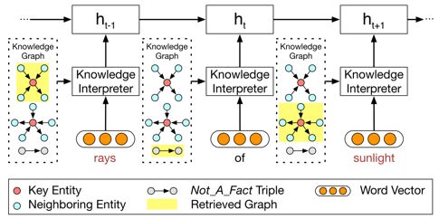 如图1所示,基于n个词输入,会输出n个词作为回复,模型的目的就是预估这么一个概率分布:,即将图信息 G 加入到概率分布的计算中。在信息读取时,根据每个输入的词x,找到常识知识图谱中对应的子图(若没有对应的子图,则会生成一个特殊的图Not_A_Fact),每个子图又包含若干三元组。