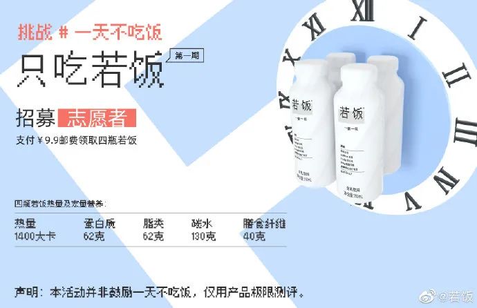 「一天不吃饭」是若饭在微博上发起的一次挑战活动,用于产品的极限测评——如果不是按照建议的食用方式用它代掉一天中的某一餐,而是一天只靠若饭维持能量,那么会怎样。