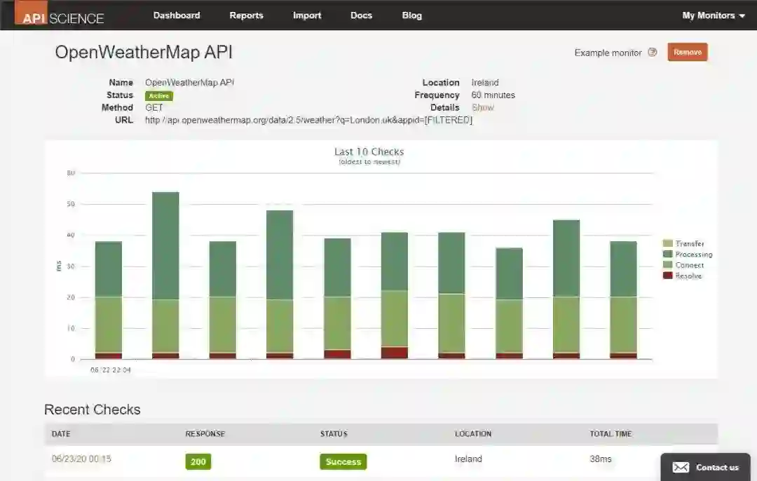 API Science 是带有图和图表的直观监视工具。API Science 可检查你的或第三方 API 的运行状况、可用性和性能,并自动通知失败状况。它的仪表板直观易用。