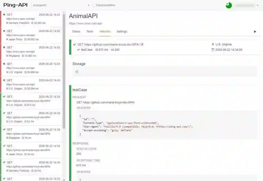 它有一些用于解析、解码和编码 URI 的基本内置函数。如果发生故障,它将通过电子邮件、Slack 或 Hipchat 发送通知。对于需要网站在全球范围内提供快速响应的 Web 开发人员而言,它非常好用。它的测试会检查来自 3 大洲 5 个地点的 API 响应,分别位于美国、日本、德国和新加坡。你可以计划从 1 分钟到一整天的运行测试。