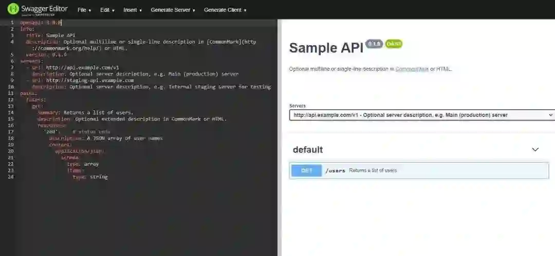 Swagger Editor 是图形可视化的流行选项。你可以使用 JSON 或 YAML 定义 API。此外,你可以为大多数相关技术(从 ASP.NET Core 和 Kotlin 到 Node.JS 和 Python)生成服务端或客户端存根。