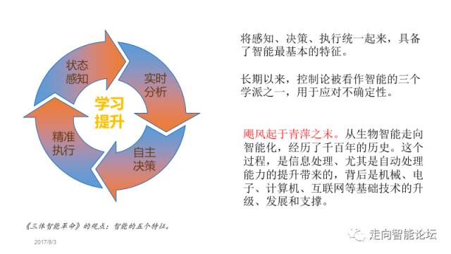 在《三体智能革命》一书中,把(一般性的)“智能”归结为20个字、5个要点:状态感知、实时分析、自主决策、精准执行、学习提升。由此看来,控制论被做为人工智能的三个学派之一是有道理的:它强调了上述5个要点中最基本的三个:感知、决策与执行。