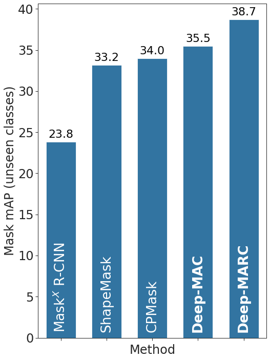 在即将发布于 ICCV 2021 的“掩码头部架构对新类别分割的惊人影响 (The surprising impact of mask-head architecture on novel class segmentation)”一文中,我们确定了 Mask R-CNN 在新类别上表现不佳的主要原因,并提出了两个易于实施的修复方法(训练协议修复;掩码头部架构修复),这两种方法协同作用,可以缩小与全监督性能之间的差距。