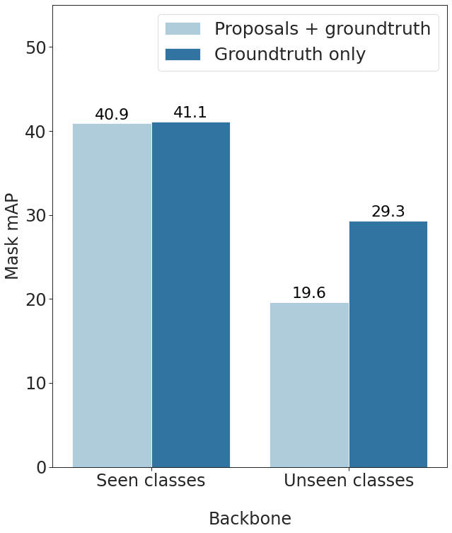 利用建议和实际边界框(默认设置)或只用实际边界框进行训练时,Mask R-CNN 在未见类上的性能。只用实际边界框训练掩码头部时,在未见类上的性能有明显的提升,mAP 超过 9%。我们报告了 ResNet-101-FPN 主干加持下的性能