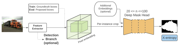 我们考虑了一个类似于 Mask R-CNN 的一般架构系列,与典型的 Mask R-CNN 训练环境相比,存在一个微小但关键的区别:我们在训练时使用实际边界框(而不是建议边界框)裁剪