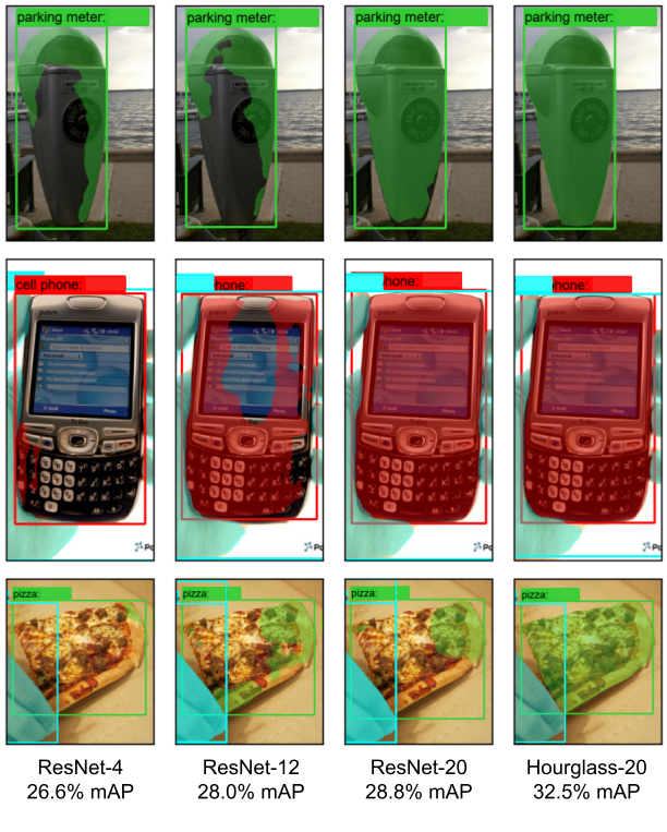 使用四种不同的掩码头部架构对未见类进行掩码预测(从左到右分别是:ResNet-4、ResNet-12、ResNet-20、Hourglass-20,其中数字是指神经网络的层数)尽管从未见过“停车计时器”、“披萨”或“手机”类中的掩码,但最右的掩码头部架构可以正确分割这些类。我们展示的掩码头部架构在掩码预测方面的性能从左到右依次递增。此外,这种差异只有在未见类上进行评估时才比较明显,如果在已见类上进行评估,所有四个架构会表现出类似的性能