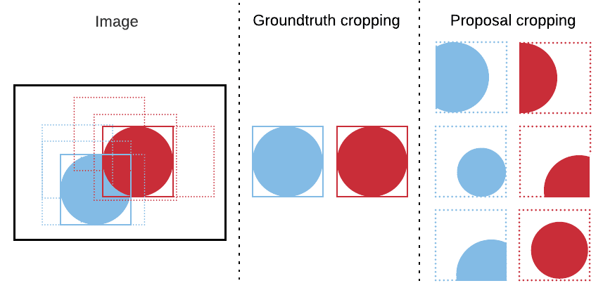 裁剪是裁剪-分割模型的一个重要步骤,通过裁剪特征图以及对应每个实例的边界框的实际掩码来训练 Mask R-CNN。将这些裁剪过的特征传递给另一个神经网络(称为掩码头部网络),该网络计算出最终的掩码预测,然后将其与掩码损失函数中的实际裁剪进行比较。裁剪有两种选择:(1) 直接对实例的实际边界框进行裁剪, (2) 对模型预测的边界框(称为建议)进行裁剪。在测试时始终通过建议来执行裁剪,因为要假设实际边界框不可用。