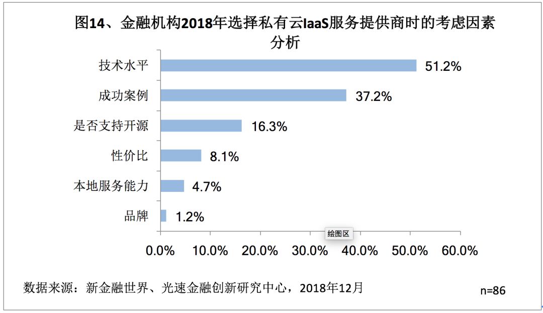 在已经建设私有的中国金融机构中,选择IaaS 服务提供商的时候最主要考虑的因素是技术水平(51.2%),其次是 IaaS 服务提供商的经验(成功案例 37.2%)和是否支持开源系统(16.3%)。