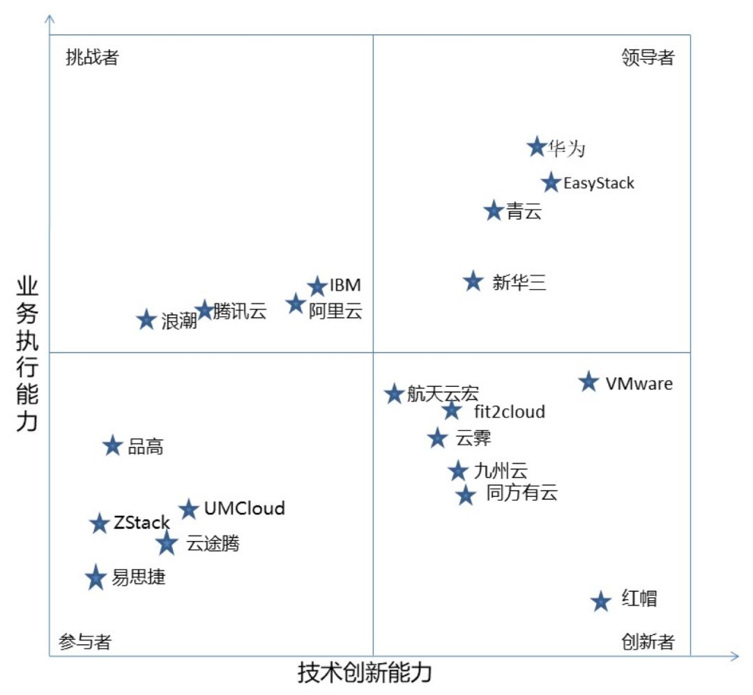 本次调研报告从技术创新能力和业务执行能力两个维度对私有云 IaaS 提供商进行了竞争力分析。