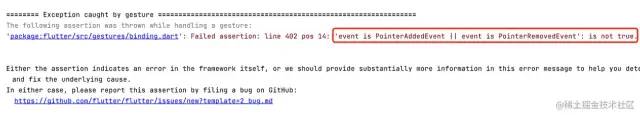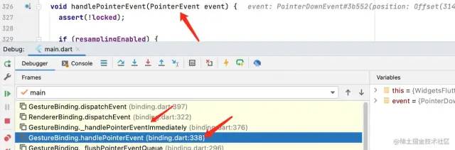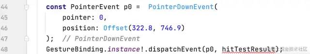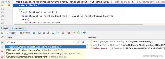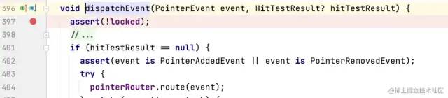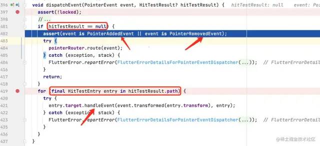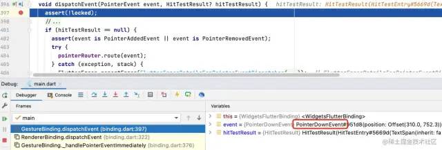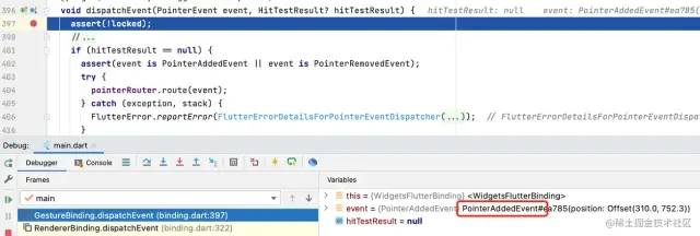 下面通过调试来看一下 GestureBinding#dispatchEvent 的逻辑处理: 402 行表示,当 hitTestResult 为 null 时,当前的 event 对象类型必须是 PointerAddedEvent 和 PointerRemovedEvent。而我们上面传入 PointerDownEvent,使用肯定会抛异常。