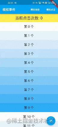 然后想到手势事件分发是由 GestureBinding 处理的,而我们可以通过 GestureBinding.instance 获取 GestureBinding 对象。那是不是意味着,可以自己来分发一个 PointerDownEvent 的消息。于是创建如下示例界面: 上部有两个按钮分别用于模拟滑动和模拟点击。