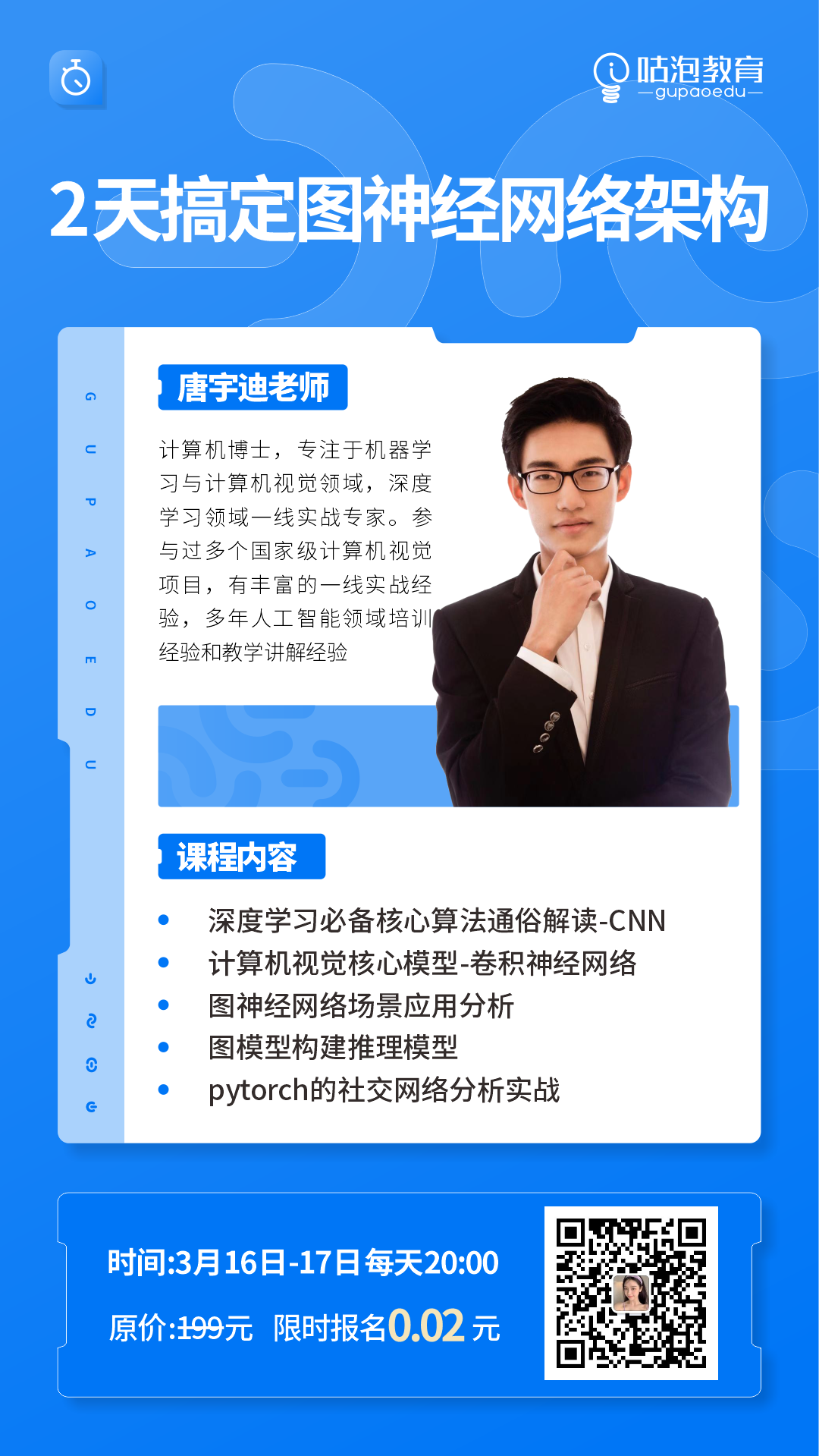 那么为了让大家更好地掌握图神经网络, 「咕泡教育」特别邀请到「人工智能实战专家 - 唐宇迪博士」,专为深度学习的同学开设了「图神经网络架构训练营 - <实战篇>」 ,既包括前沿的学术分享、又有来自头部大咖的实践分享。