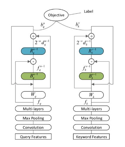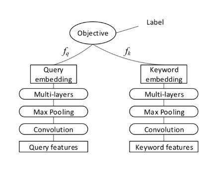 如图 3 所示,RBE 模型旨在为搜索广告中的查询和关键词,生成紧凑的向量表征。RBE 模型是基于 CLSM 模型 [8] 构建而成(CLSM 模型架构如图 2 所示)。